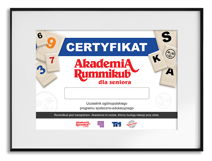 Placówki realizujące Akademię Rummikub dla seniora otrzymują imienny certyfikat potwierdzający udział w ogólnopolskim programie. Certyfikat przekazywany jest w formie elektronicznej do samodzielnego wydruku przez placówkę.